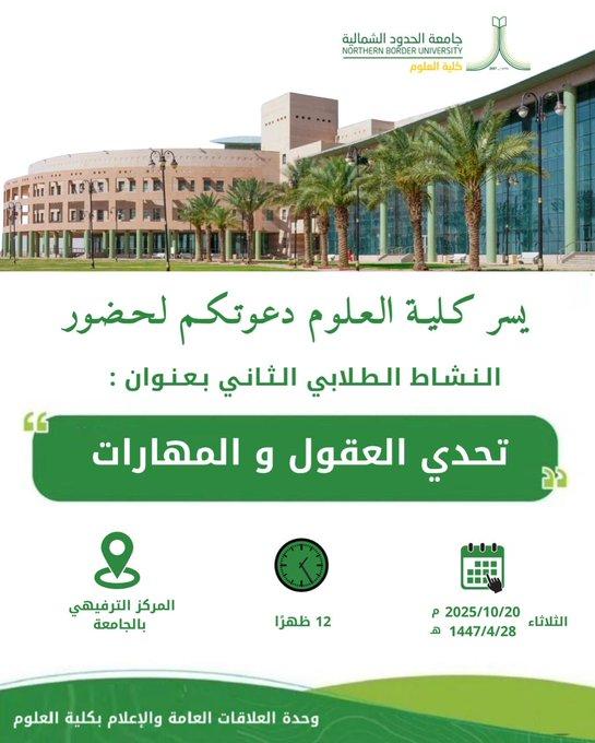يسر كلية العلوم ممثلة بقسم علوم الحاسبات، دعوتكم لحضور لقاء ضمن مبادرة الذكاء الاصطناعي جسر بين التخصصات والمجتمع، بعنوان: كلية العلوم والهندسة والذكاء الاصطناعي والتي ستُقام يوم الاثنين الموافق ٢٠٢٥/١٠/٢٠م الساعة السادسة مساءً عن بعد. https://eu.bbcollab.com/guest/d7e2c84acb4246d6b05719c2e388b036