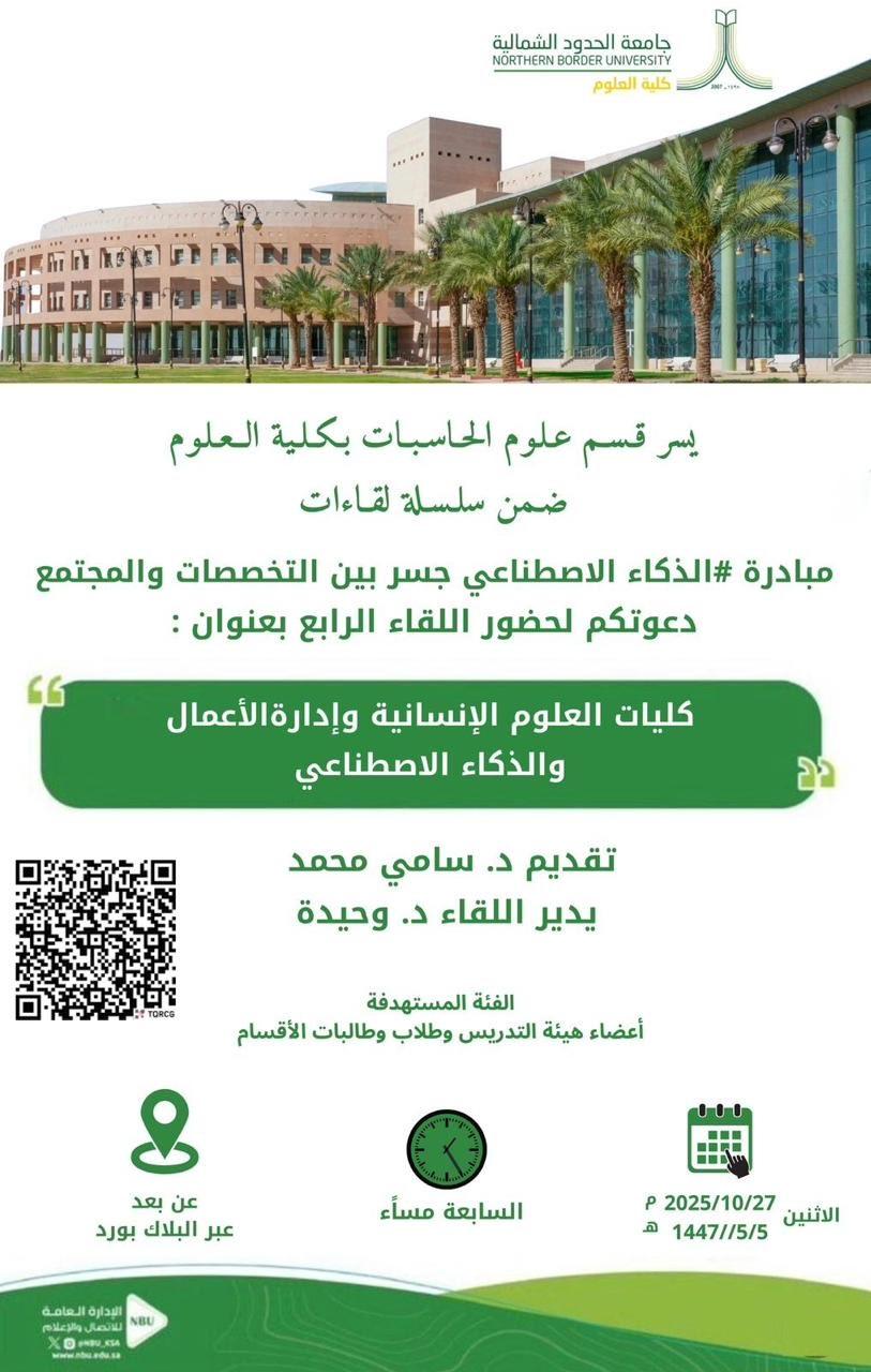 يسر كلية العلوم ممثلة بقسم علوم الحاسبات، دعوتكم لحضور لقاء ضمن مبادرة الذكاء الاصطناعي جسر بين التخصصات والمجتمع، بعنوان: الموظف الإداري والذكاء الاصطناعي 06 جمادى الأول 1447
