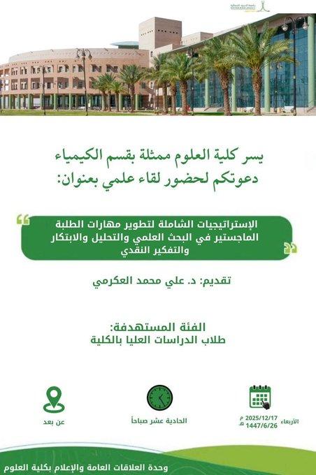 يسر كلية العلوم ممثلة بقسم علوم الحاسبات دعوتكم لحضور لقاء علمي بعنوان: “The Utilization of Artificial Intelligence in Indexing and Managing Scientific References” تقديم: د. فاروق علي حسن يدير اللقاء العلمي: د. وئام المليح