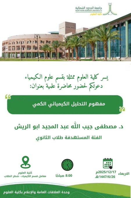 يسر كلية العلوم ممثلة بقسم الكيمياء دعوتكم لحضور لقاء علمي بعنوان: الاستراتيجيات الشاملة لتطوير مهارات الطلبة الماجستير في البحث العلمي والتحليل والابتكار والتفكير النقدي