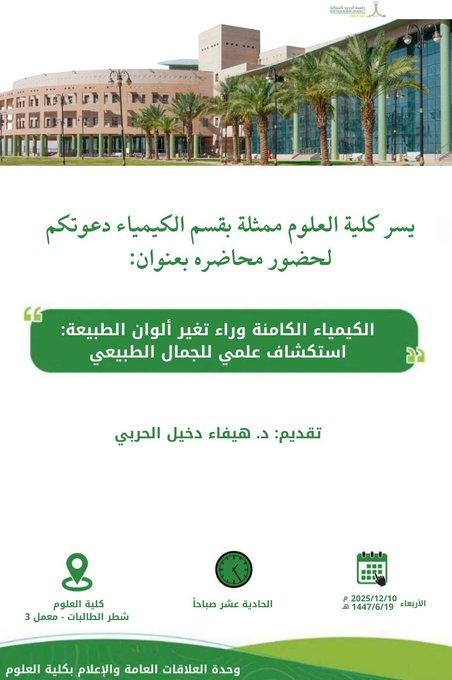يسر كلية العلوم ممثلة بقسم الرياضيات دعوتكم لحضور نشاط طلابي بعنوان: "وراء كل جمال معادلة خفية" تقديم: لجنة الأندية الطلابية – شطر الطالبات