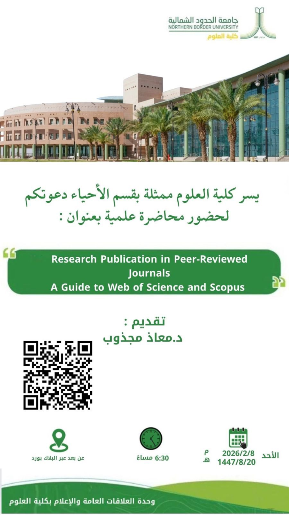 يسر كلية العلوم ممثلة بوكالة الكلية للشؤون الأكاديمية دعوتكم لحضور ورشة عمل بعنوان: الآلية المعتمدة لدراسة الأعذار الطلابية في كلية العلوم تقديم: د. رمله حميد البيات