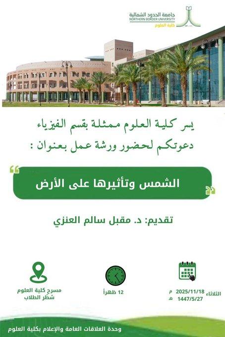 يسر كلية العلوم ممثلة بقسم علوم الأحياء دعوتكم لحضور ورشة العمل المقامة غداً بعنوان تهيئة البيئة التعليمية داخل المعامل. الساعة ١١ صباحاً.