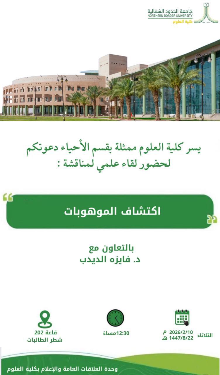 إعلان رسمي – لقاء رئيس قسم علوم الأحياء مع طلاب وطالبات فرع رفحاء يسرّ قسم علوم الأحياء بكلية العلوم الإعلان عن عقد لقاء تفاعلي عن بعد مع رئيس القسم لمناقشة وضع الدراسة واحتياجات الطلاب والطالبات، والاستعداد للاختبارات النهائية، ومناقشة الأمور المتعلقة بمسار الأحياء الدقيقة. محاور اللقاء: متابعة وضع الدراسة الحالية والتحديات