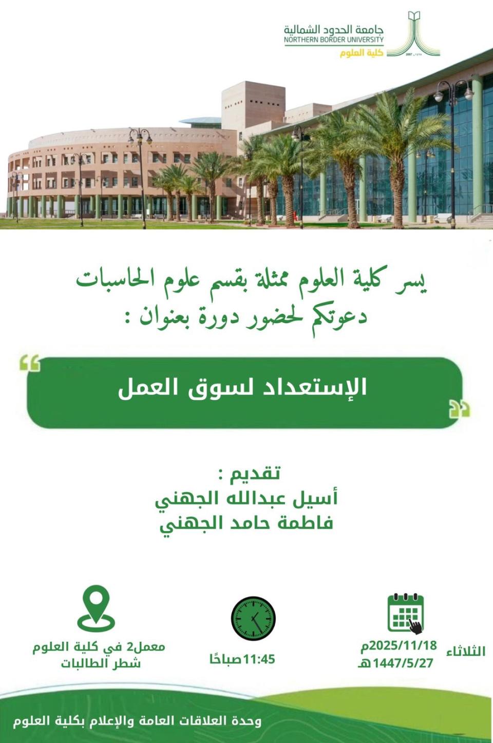 يسر كلية العلوم ممثلة بقسم علوم الحاسبات دعوتكم لحضور دورة بعنوان: الإستعداد لسوق العمل والتي ستُقام يوم الثلاثاء الموافق ١٨-١١-٢٠٢٥م في الساعة ١١:٤٥ صباحاً.