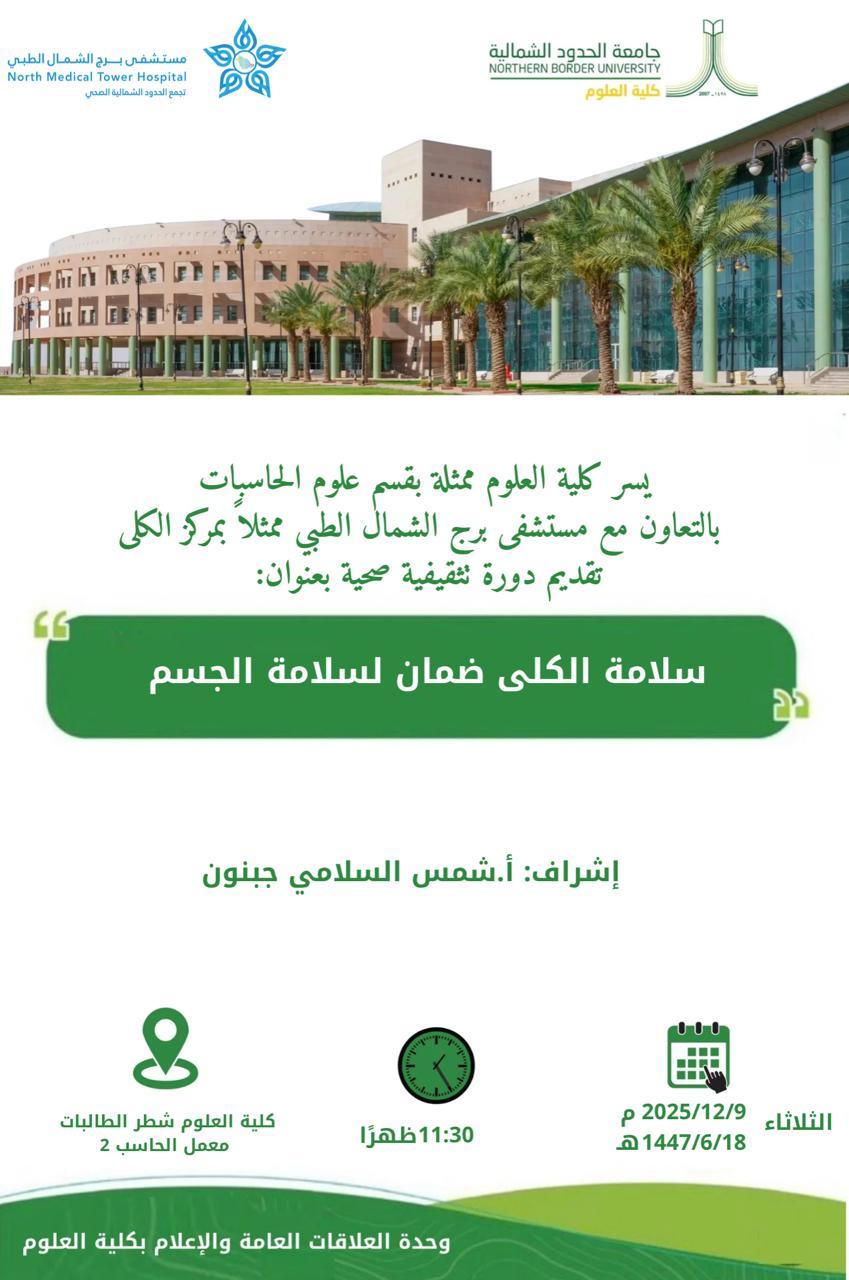 يسر كلية العلوم ممثلة بقسم علوم الحاسبات بالتعاون مع مستشفى برج الشمال الطبي ممثلاً بمركز الكلى تقديم دورة تثقيفية صحية بعنوان: سلامة الكلى ضمان لسلامة الجسم