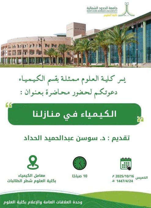 يسر كلية العلوم ممثلة بقسم الكيمياء دعوتكم لحضور ورشة بعنوان: الكيمياء علم الدهشة والخيال 26 ربيع الثاني 1447