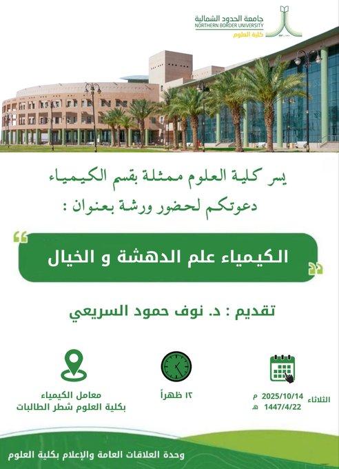 يسر كلية العلوم ممثلة بقسم الكيمياء دعوتكم لحضور ورشة بعنوان: الكيمياء في منازلنا 26 ربيع الثاني 1447
