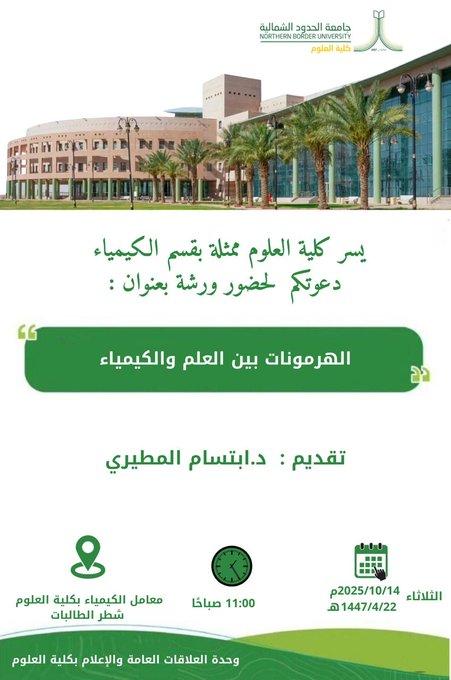 يسر كلية العلوم ممثلة بقسم الكيمياء دعوتكم لحضور ورشة بعنوان: الكيمياء علم الدهشة والخيال 26 ربيع الثاني 1447