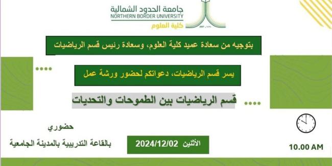 أقامت كلية العلوم ممثلة بقسم الرياضيات ورشة عمل بعنوان:"قسم الرياضيات بين الطموحات والتحديات لأعضاء هيئة التدريس بقسم الرياضيات" و كان ذلك التاريخ: الاثنين 2024/12/02 الساعة
