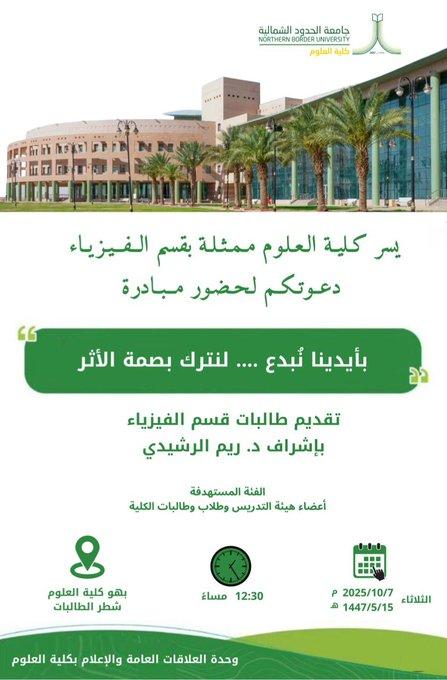 يسر قسم الفيزياء بكلية العلوم أن يعلن عن موعد مناقشة رسالة الماجستير للطالبة أسماء بنت السلوم العنزي، يوم الخميس 2022/10/6م، بتمام الساعة العاشرة صباحاً، على مسرح كلية العلوم.
